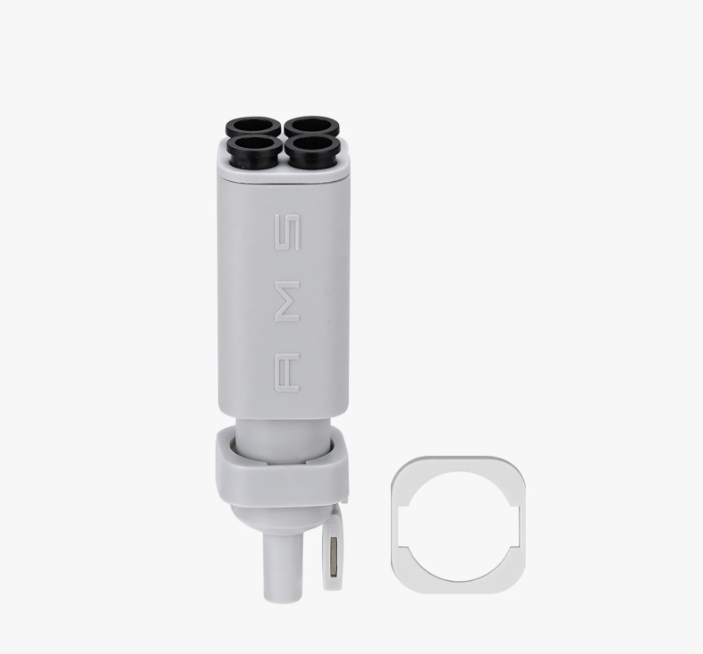 The AMS lite Filament Hub is a key part of reliable filament switching during multi-color or multi-filament printing. One end of the hub connects to 4 different PTFE tubes (up to 4 filaments), while the other end connects to the top of the extruder to feed filament.