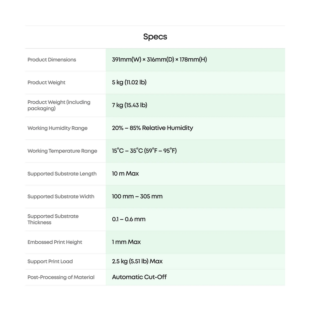 | Maximum Print Load | 2.5 kg |