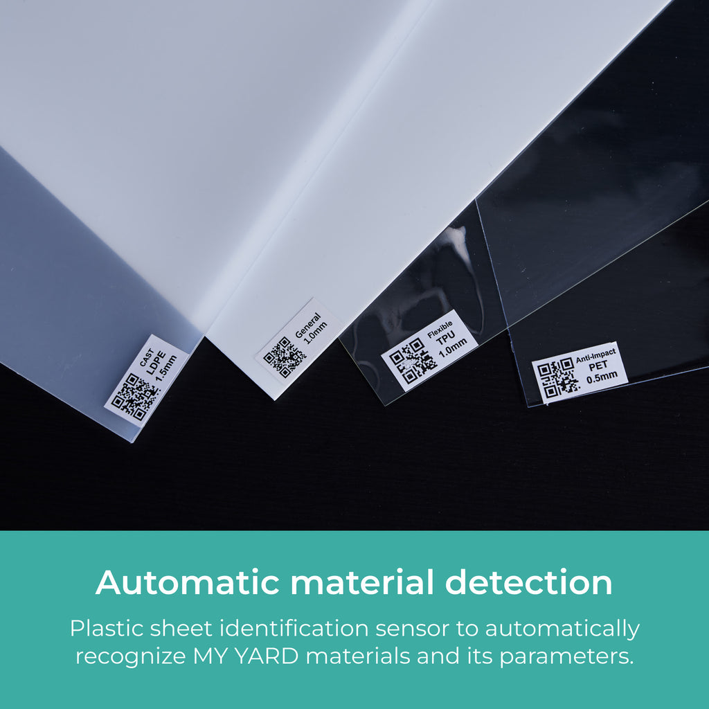 World’s first built-in plastic sheet identification sensor. Scan the QR code on MY YARD sheets to instantly load the correct parameters.